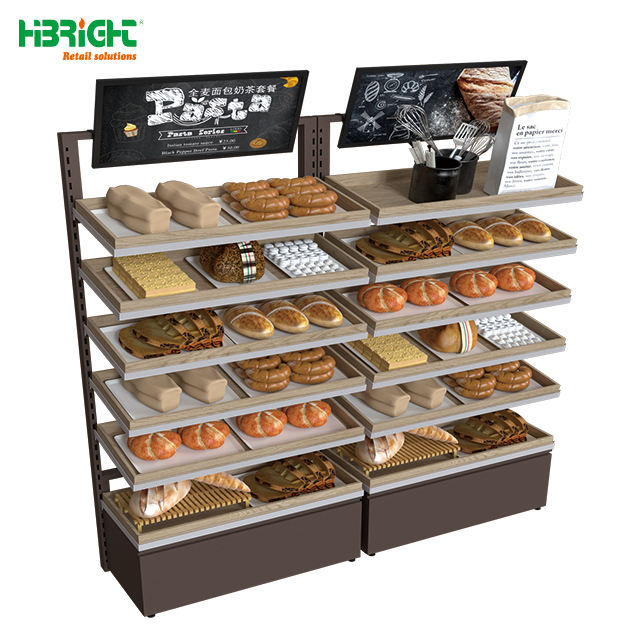 Customized Supermarket Interior Wood Display Island Counter Bakery Shelves Rack Basket Bread Display Showcase