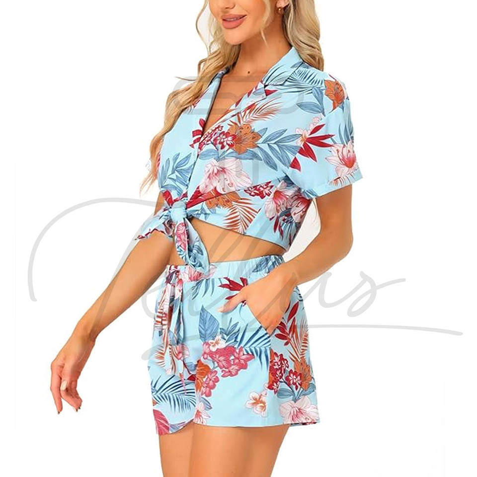 Customized Two Piece Set Women Clothing Short Sleeved Hawaiian Designer Printed Linen Shirts Womens Sets