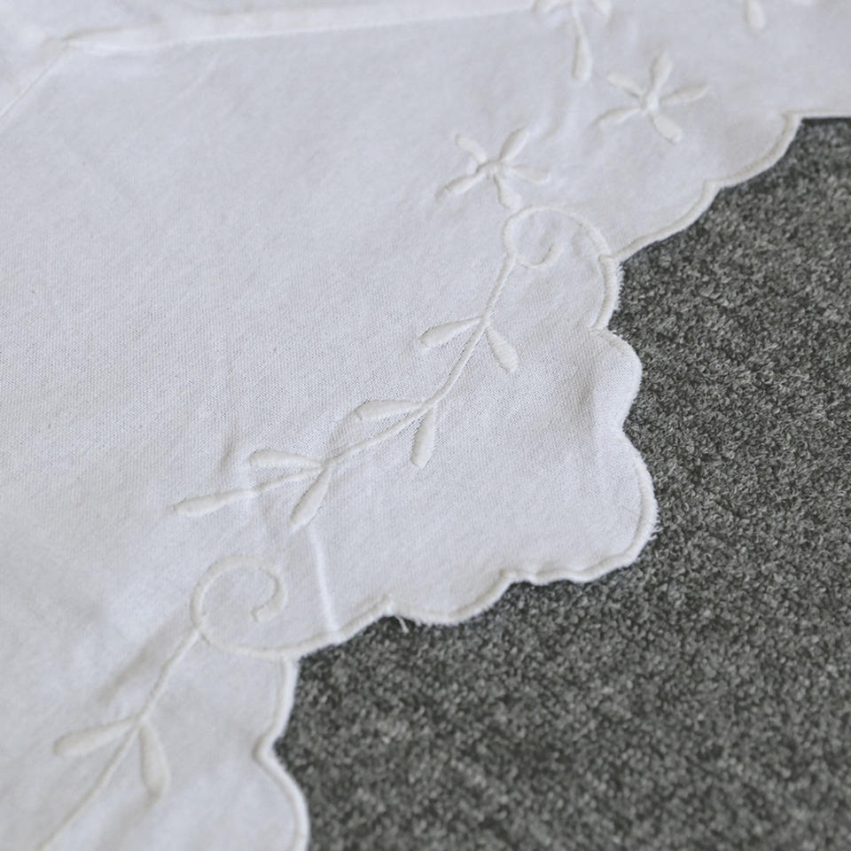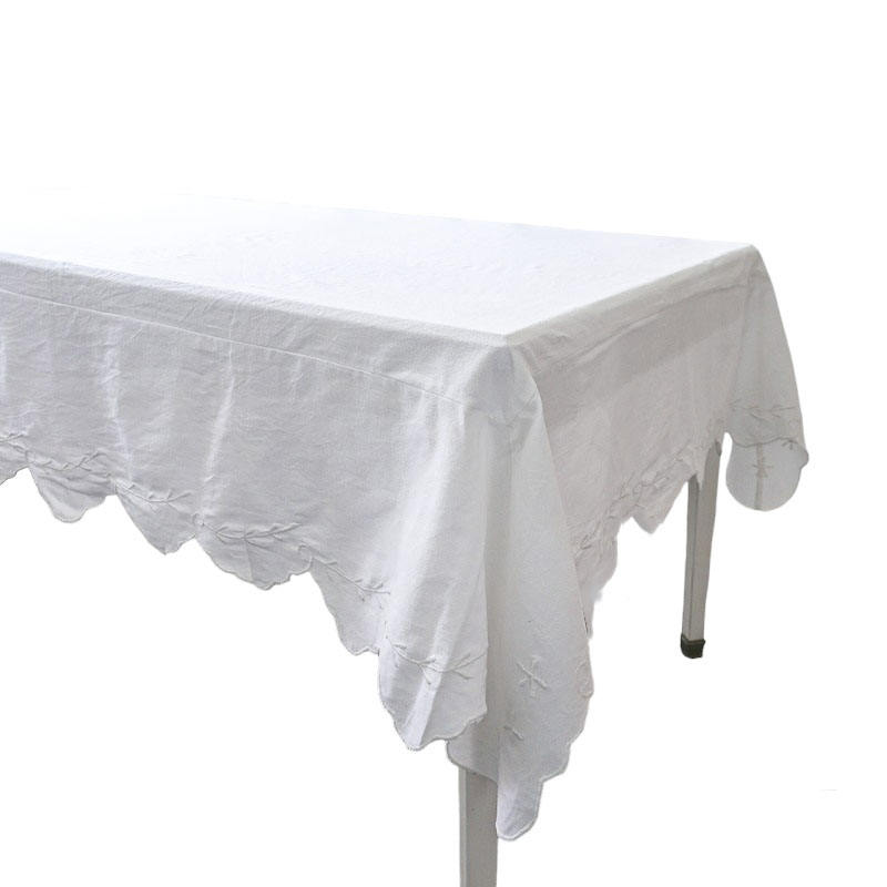 Customized Wholesale Embroidery White Floral Design Table Cloth Cotton Scalloped Border Tablecloth for Home Hotel Events