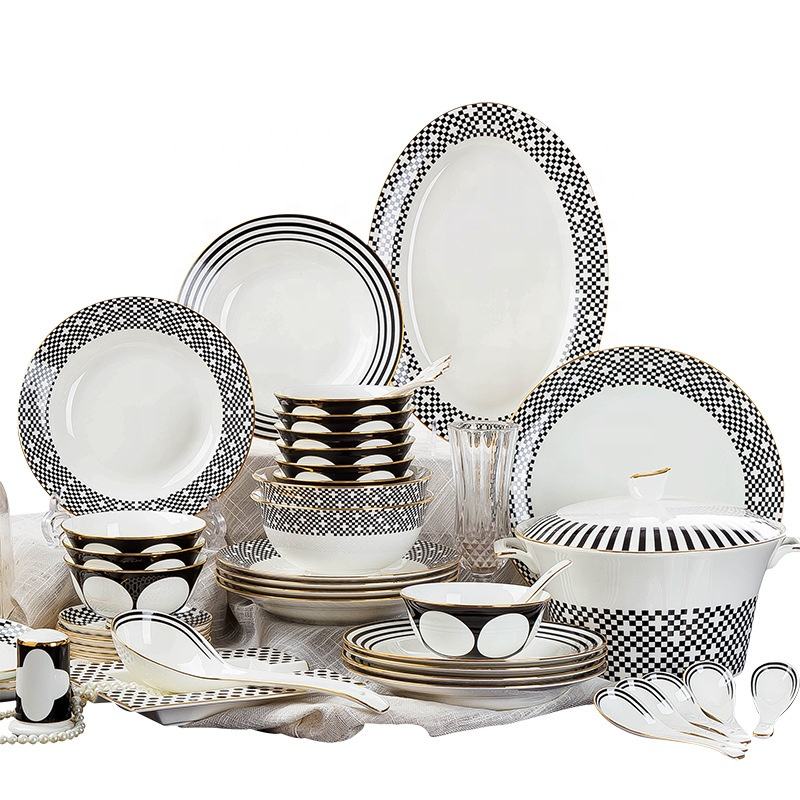 Customized Wholesale European Classic Black and White Bone China Plant Pattern Dinner Set Ceramic Plates Bowls for Business Gift