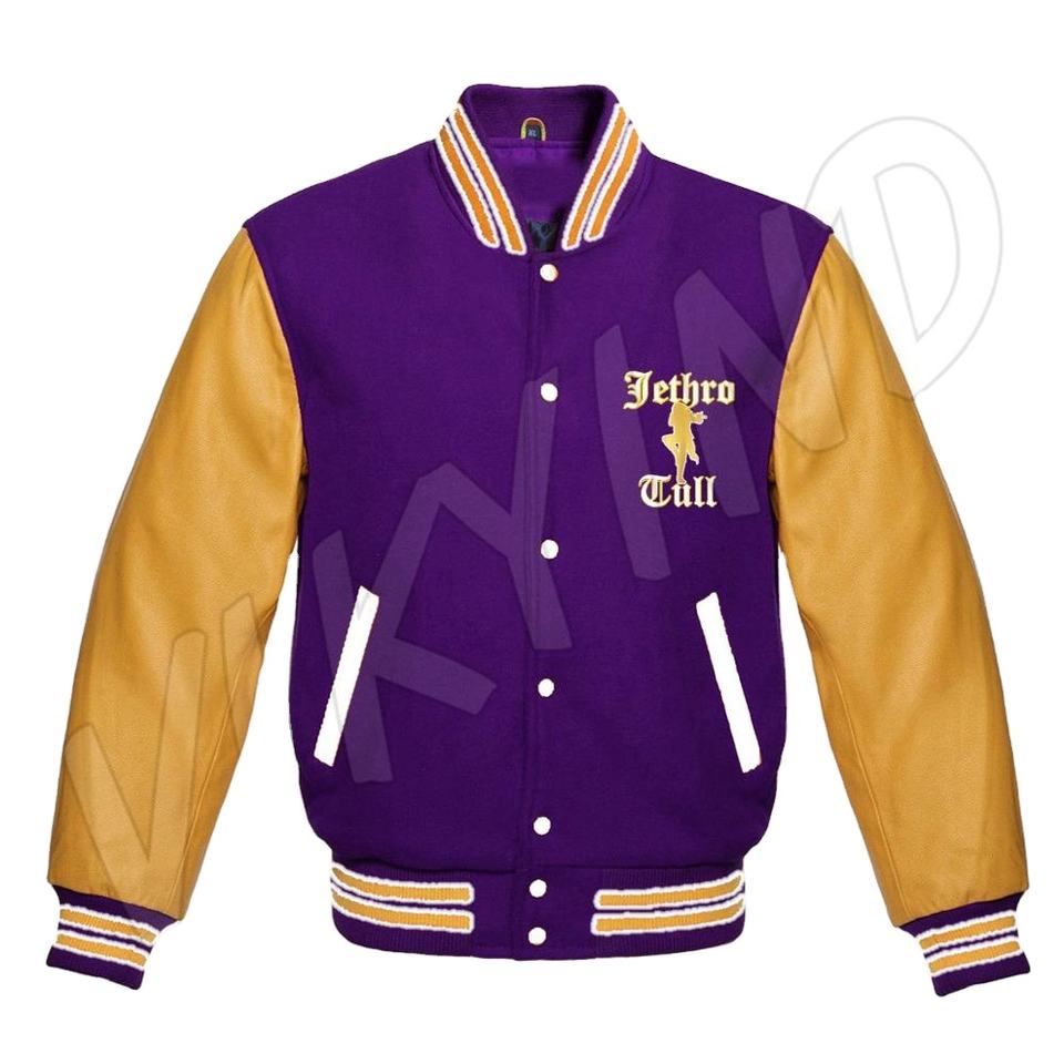Customized Wholesale OEM Logo Printed Jethro Purple Body Gold Sleeves Men's Baseball Jackets High Quality Varsity Jackets