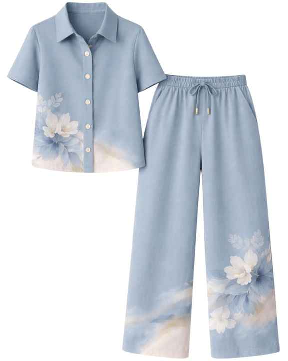 Customized Womens Blush Pink Floral Printed Two Piece Co Ord Set Short Sleeve Button Shirt With Wide Leg Pants Casual Outfit