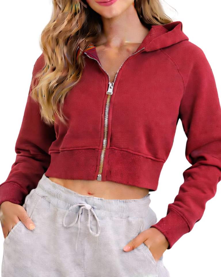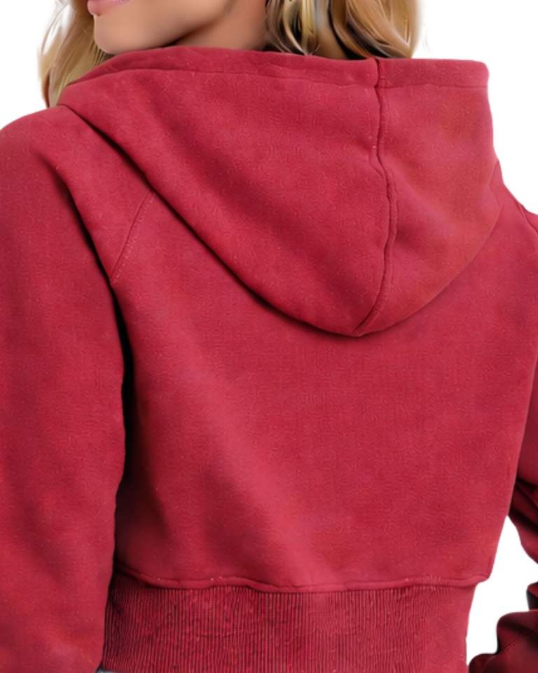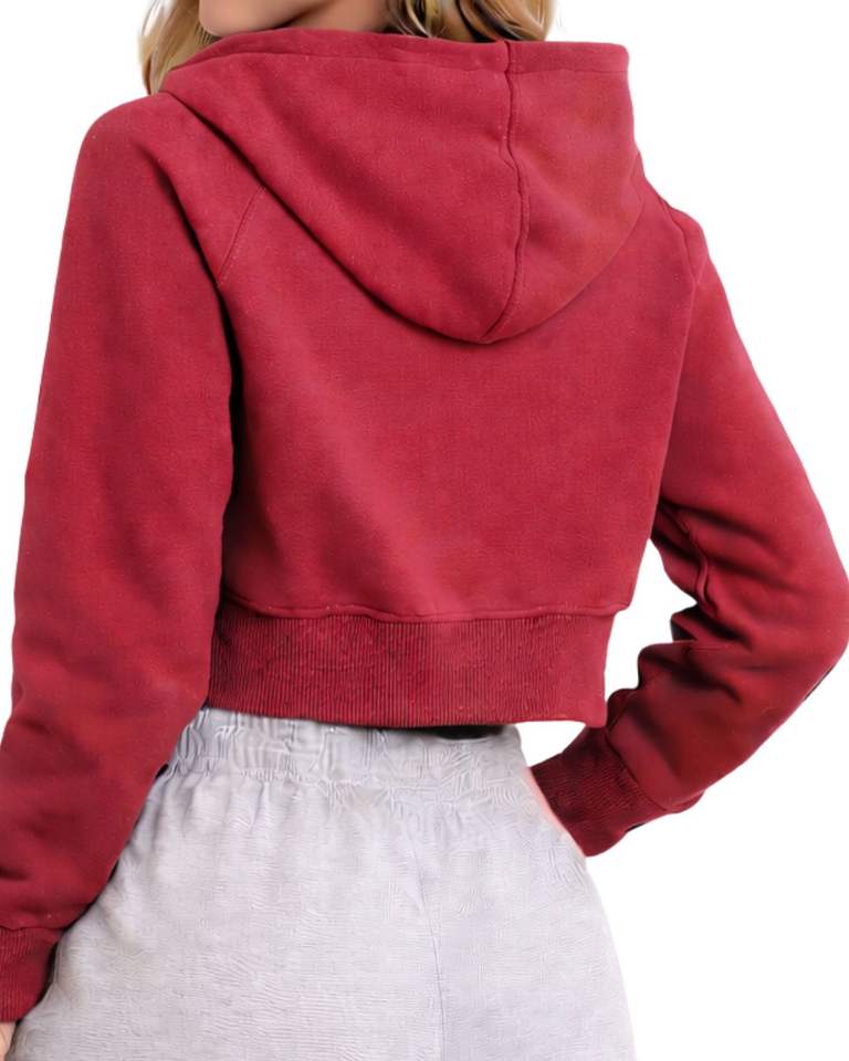 Customized Womens Cropped Zip Up Hoodie Long Sleeve Casual Sweatshirt Soft Fleece Streetwear Wine Red Color Autumn Winter Wear