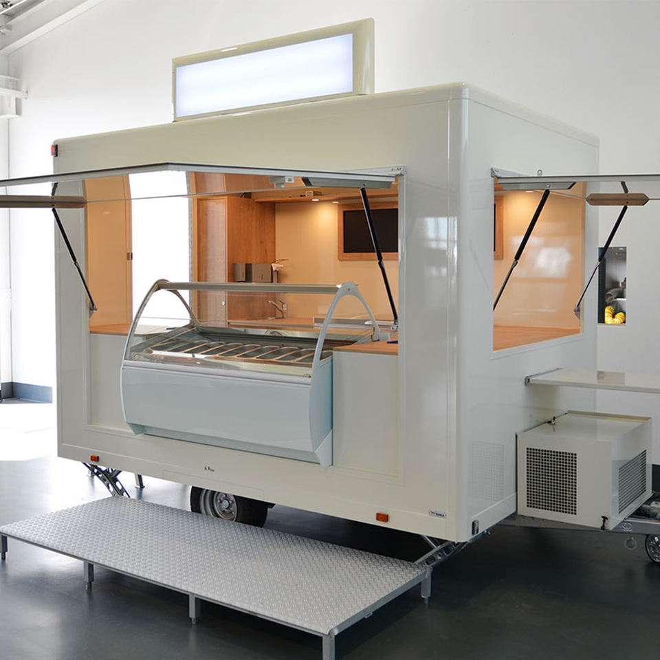 Customized food trailers, with full kitchen food truck containers, pizza barbecue grills, and mobile restaurants