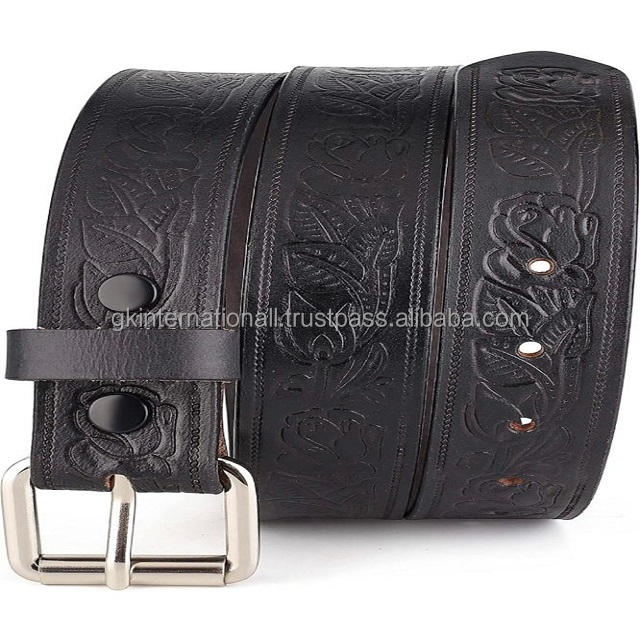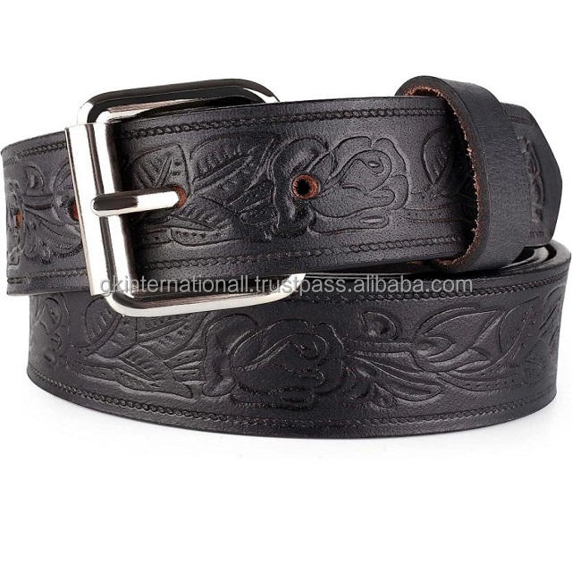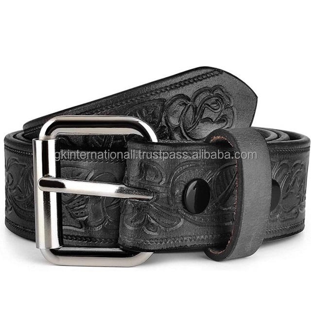 Customized Hand Carved Floral Embossed Western Leather Tooling Belt with Stylish Nickel Plated Roller Pin Buckle Made in India