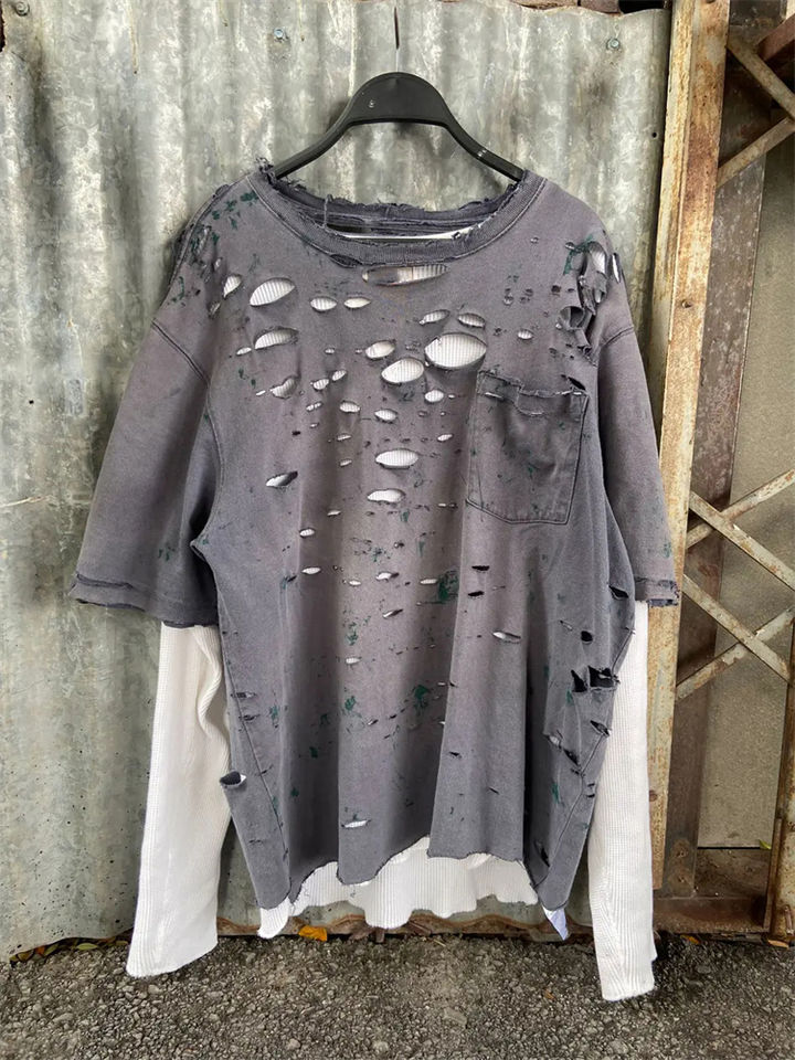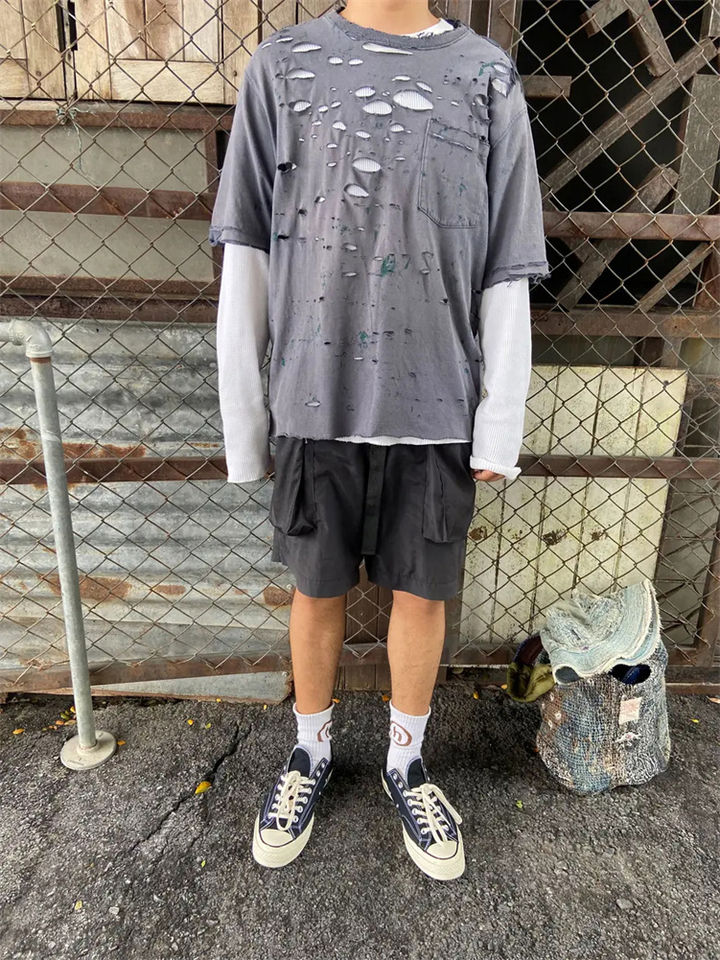 Customized logo 100% Cotton Knitted Tshirt Waffle Acid Wash Ripped Distressed Double Layer Short Sleeve Printed Regular Fit High