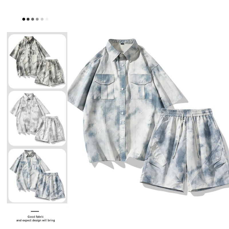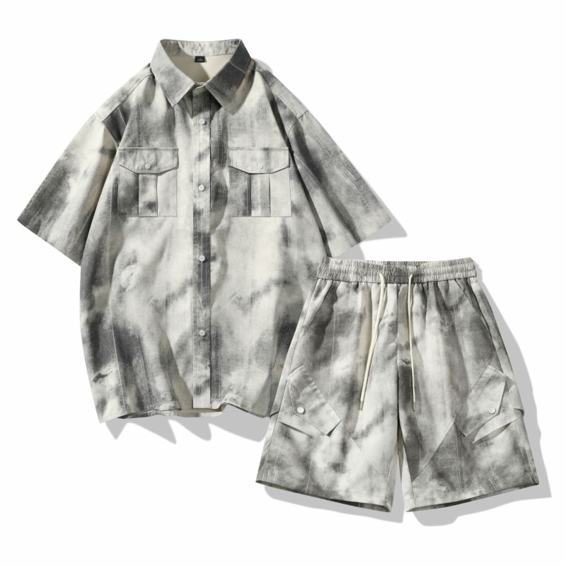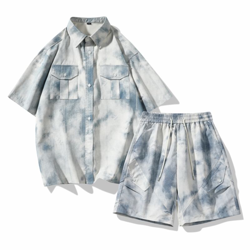 Customized logo Ink tie-dyed short-sleeved shirt men's summer fashion American cropped sleeve shirt handsome shorts T-shirt suit