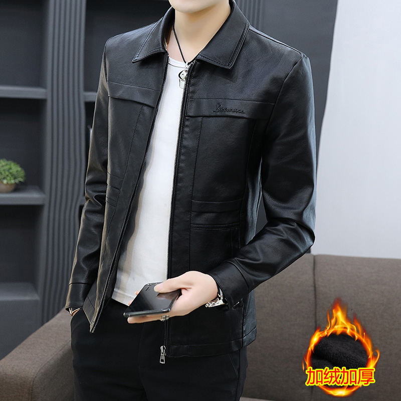 Customized logo Leather men plus velvet 2024 winter new men's Korean version of slim lapel green casual coat warm comfortable