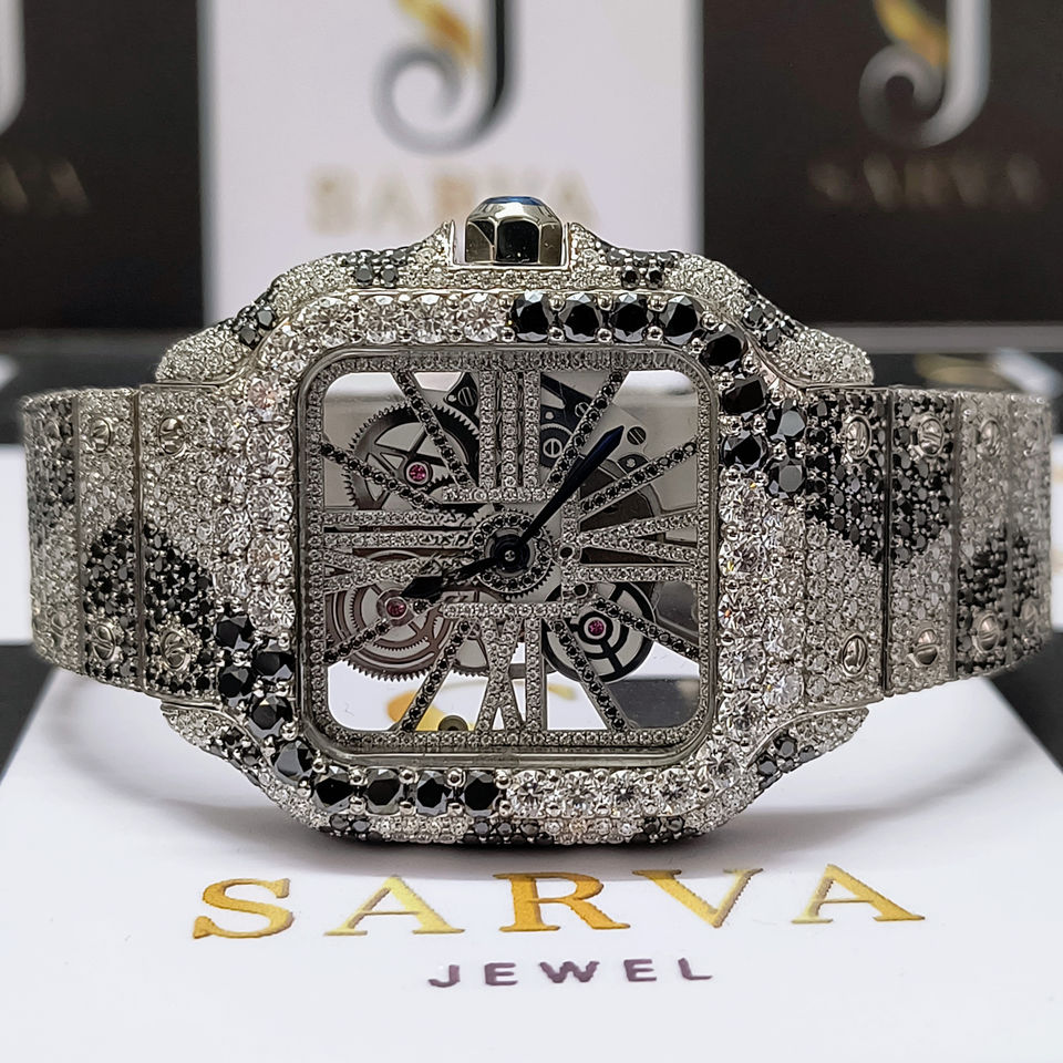 Customized Luxury Men's Watch Analog Mechanical Black Diamond Display Stainless Steel Case White Gold Band ETA Movement