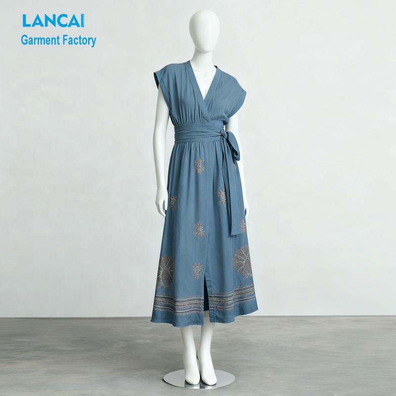 Cut and Sew Apparel Manufacturing Loose-fit Women's Rayon Sleeveless Floral Embroidery Midi Wrap Dresses with Belt