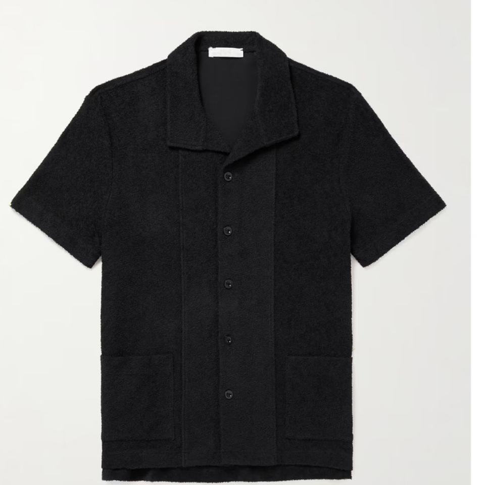 Cut and Sew Men's French Cotton Terry Short Sleeved Button up Blank Corduroy Crew-neck Camp Collar Shirts for Men