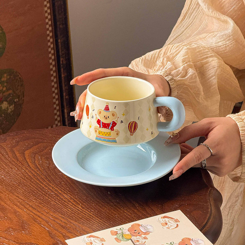Cute Cartoon Circus Ceramic Coffee Mug and Saucer Set Girl Heart Student Gift Water Cup