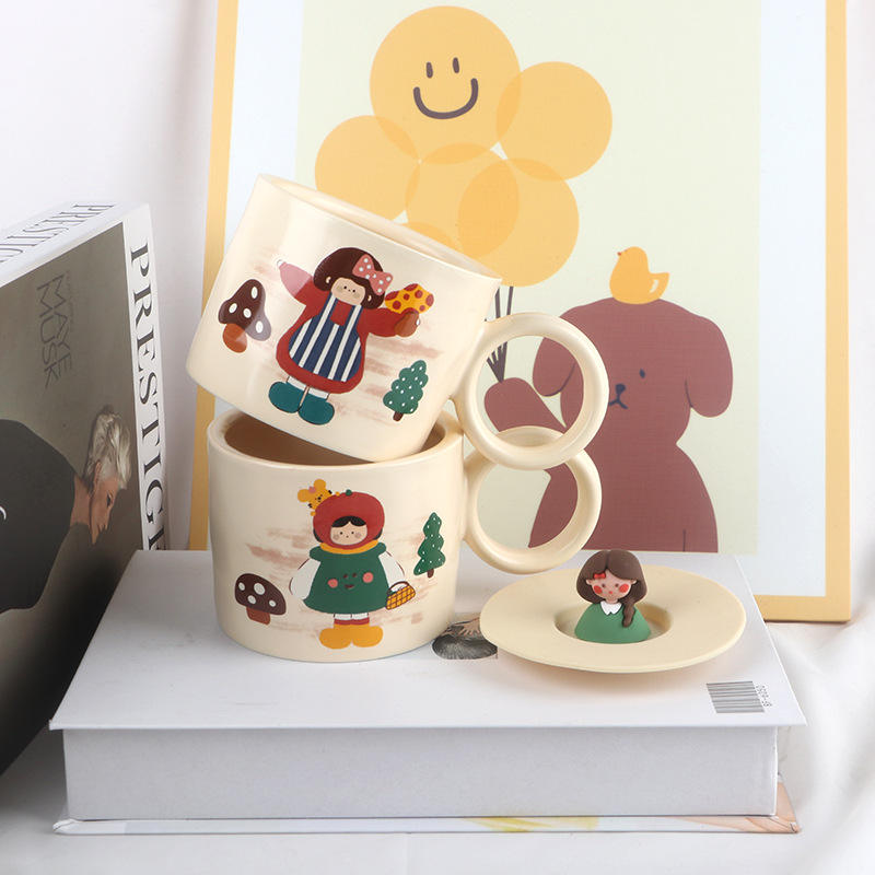 Cute Cartoon Girl Ceramic Mug With Handle Solid Color Design For Office Breakfast Milk Cup Gift Idea