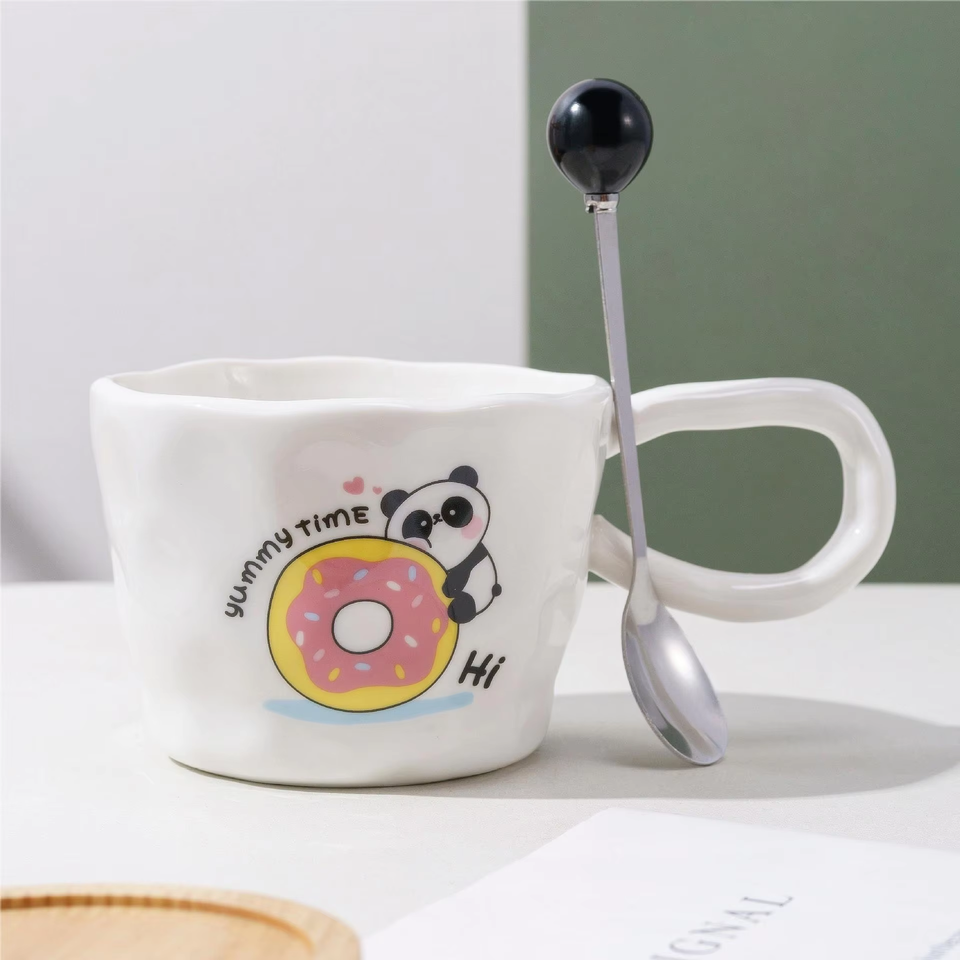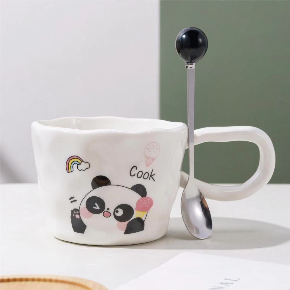 Cute Cartoon Panda Pattern Handmade Coffee Cups Custom Tea Cup Ceramic Coffee Mug Breakfast Cups Water Mug With Spoon