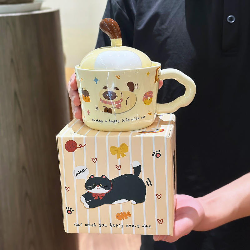Cute Cat Tail Ceramic Cup with Lid and Spoon Cartoon Design for Coffee or Milk Presents Office Use