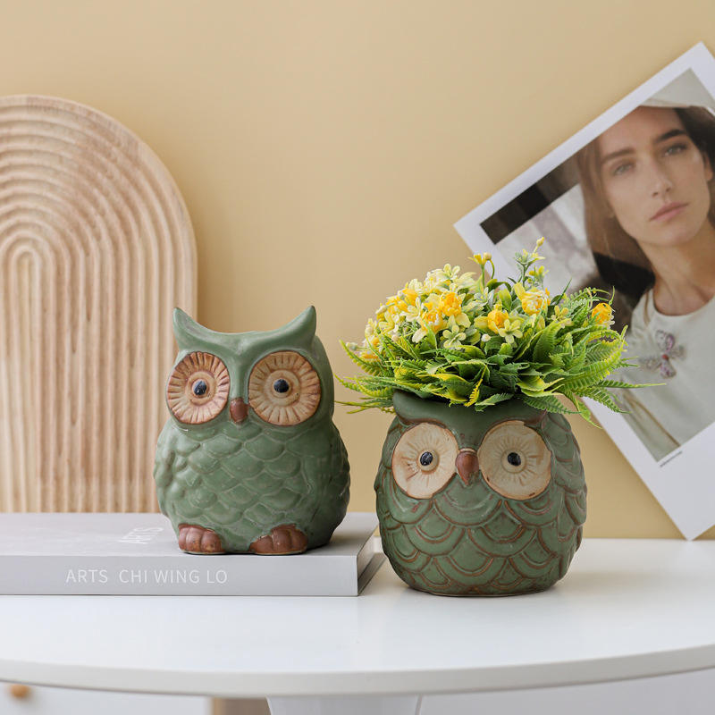 Cute Creative Mini Cartoon Ceramic Flower Pot Decoration Personalized Small Animal Owl Modern Glazed Kiln Turned Bronze Green