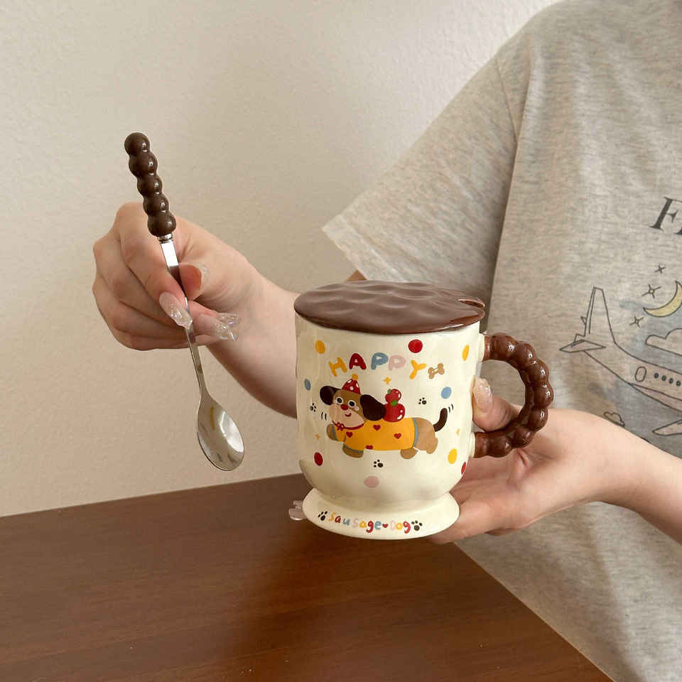 Cute Dachshund Ceramic Mug With Lid And Spoon Single Cup Cartoon Design For Coffee Tea Milk Breakfast Gift Home Use