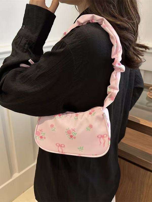 Cute Floral Pattern Underarm Shoulder Bag with Ruched Strap for Women