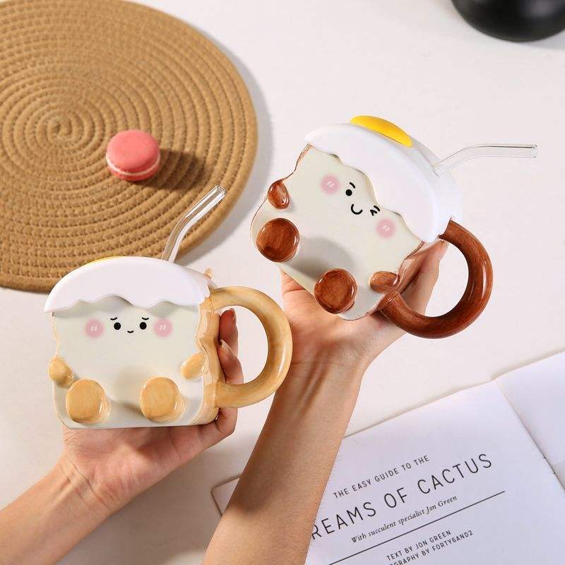 Cute High Appearance Level Couple Ceramic Water Cup Mug Straw Birthday Gift Home Coffee Cup with Lid Bread Cup