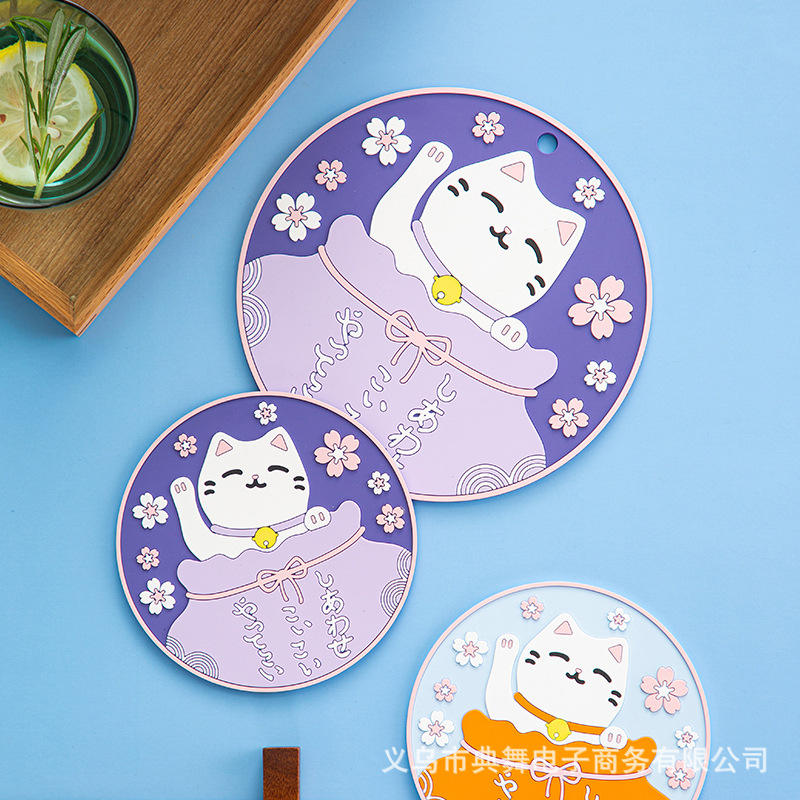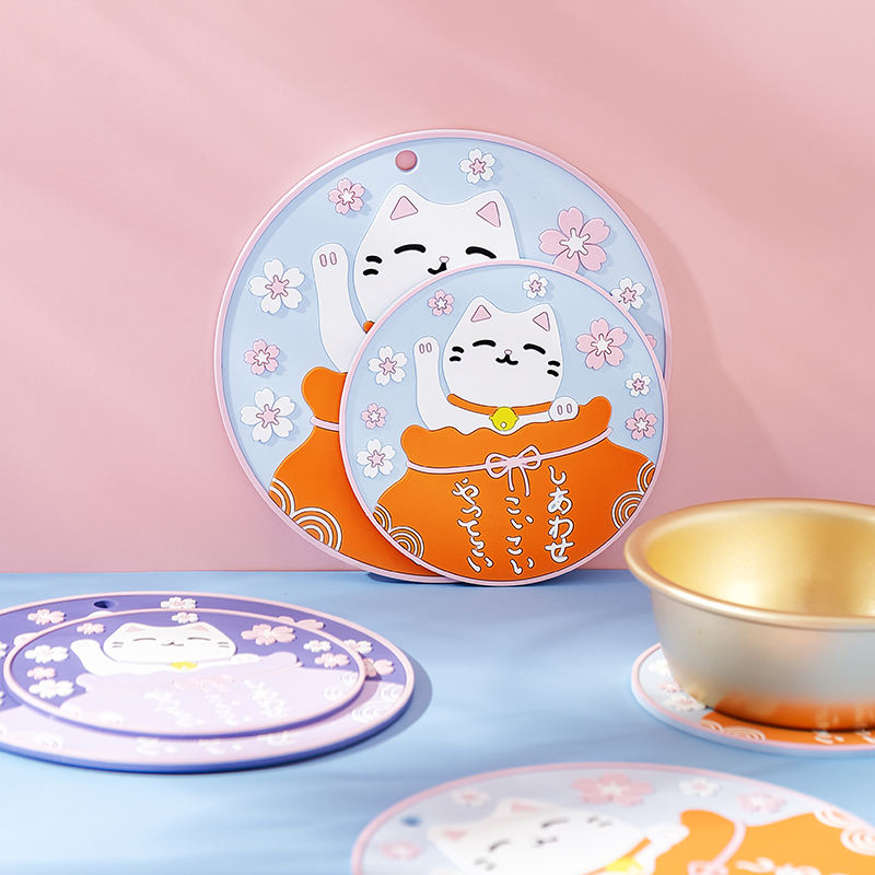 Cute Japanese-Style 3D Cat Round PVC Anti-Scald Dining Mat 1PC Heat Insulation Pad Hanging Feature Anti-Slip Kitchen