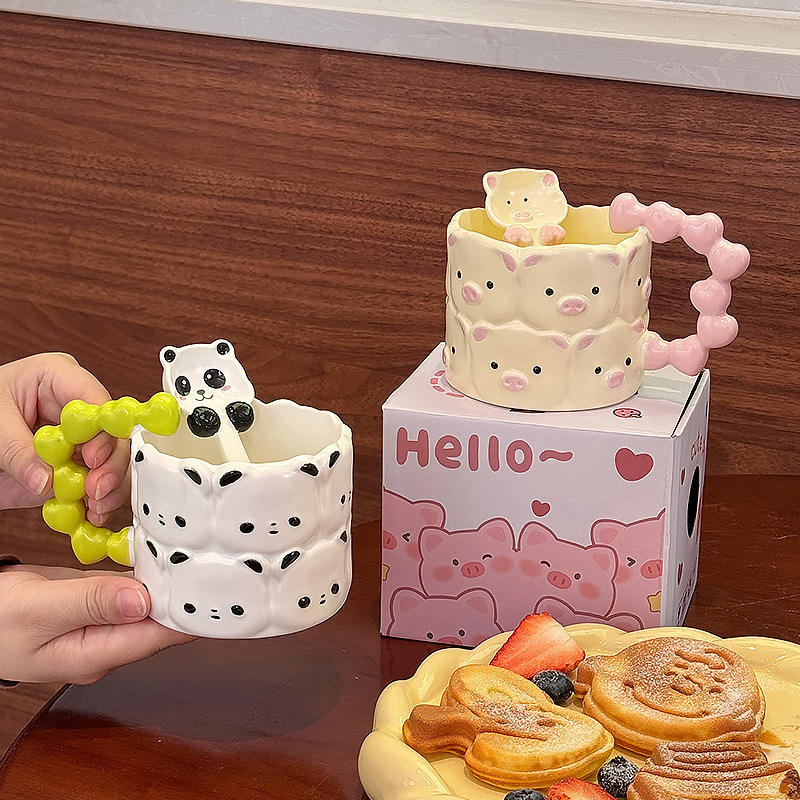 Cute Panda Ceramic Mug With Spoon Cartoon Design Pink And Green Handle Office Coffee Cup For Gift