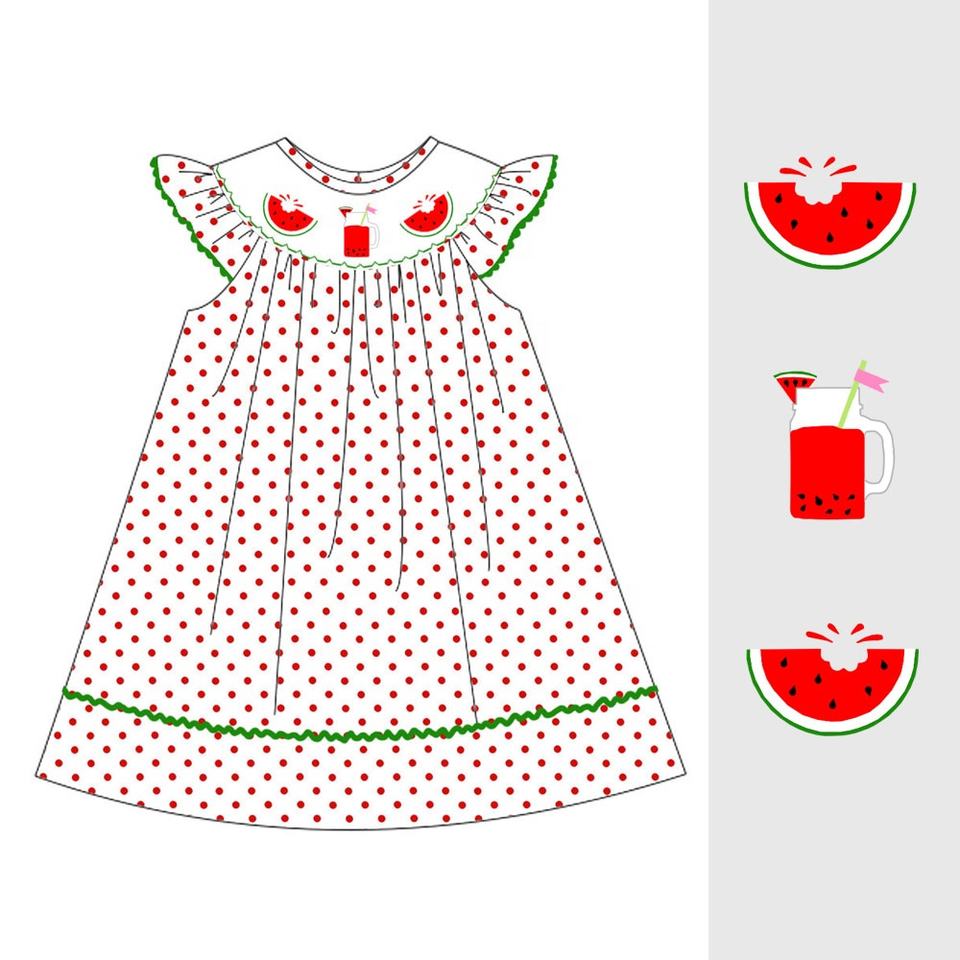 Cute Knee-Length Summer Bishop Dress for Baby Girls Watermelon Smocked with Dot Pattern Children's Clothing