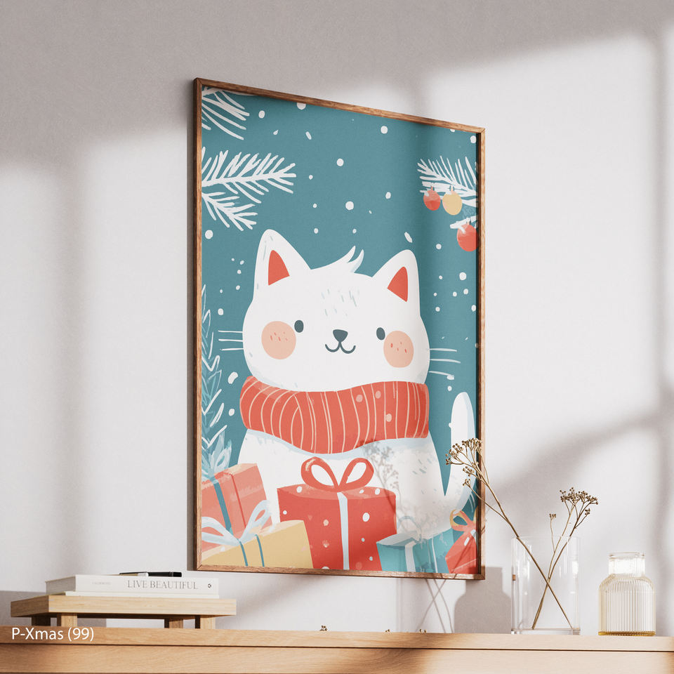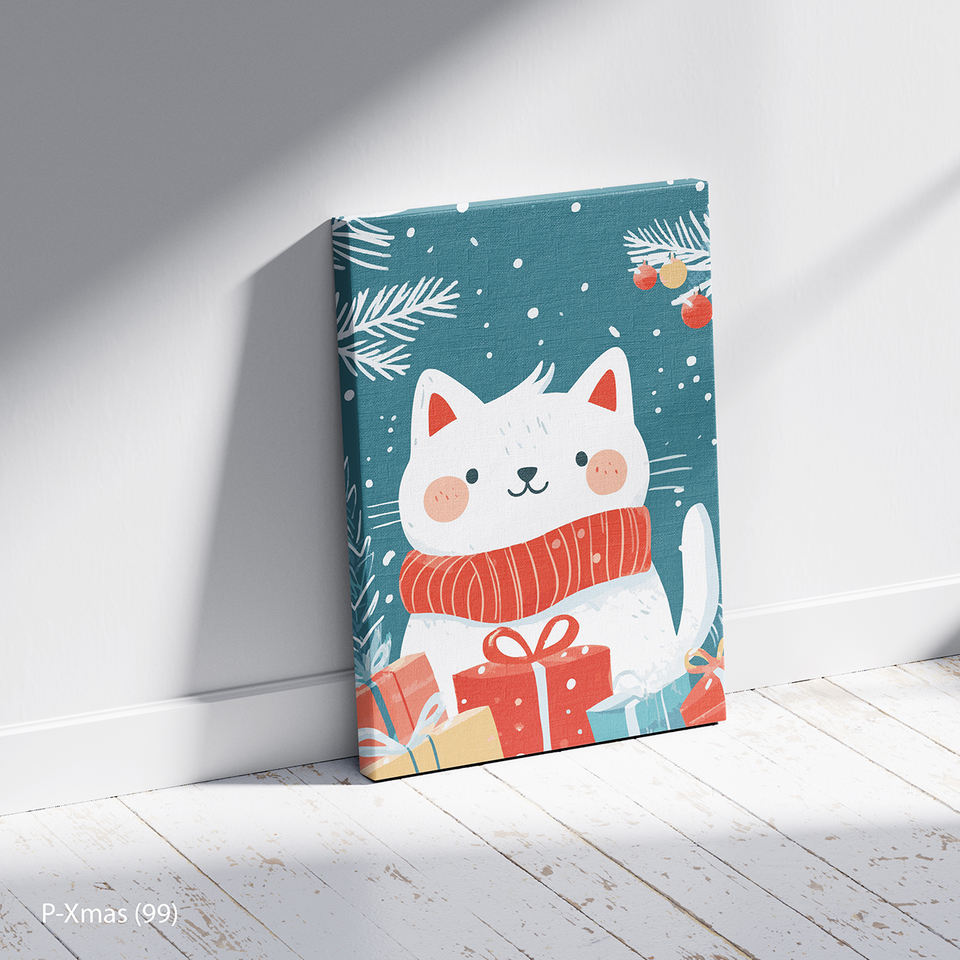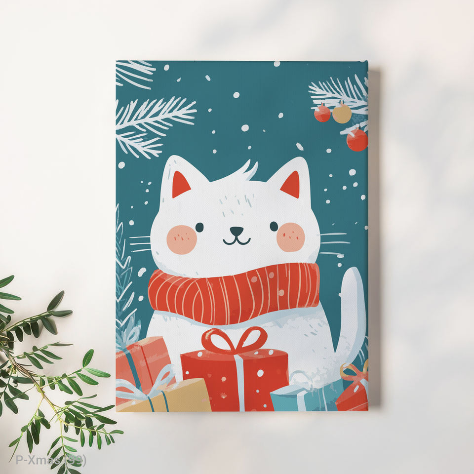 Cute White Cat with Red Scarf Modern Christmas Gift Canvas Print on Wood Frame