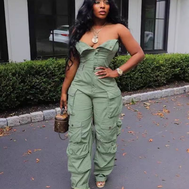Viviblook Z509JP02 New Sexy Backless Slim Fit High Waisted Sleeveless Multi Pocket One-Piece Cargo Jumpsuit for Women Bodycon