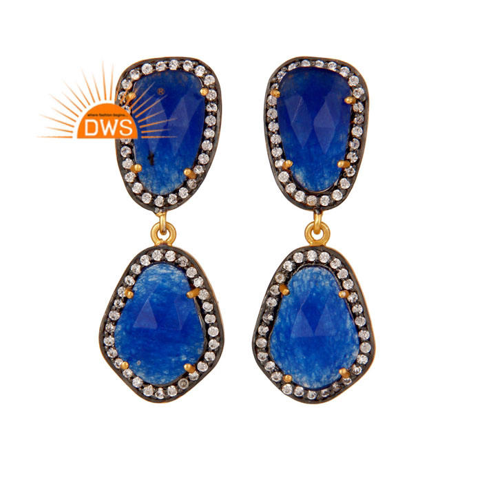 Cz Blue Aventurine Set Classic Turkish Design Girl's Earrings Jewelry Supplier Gold Plated Brass Natural Orthodox Zircon Pyramid