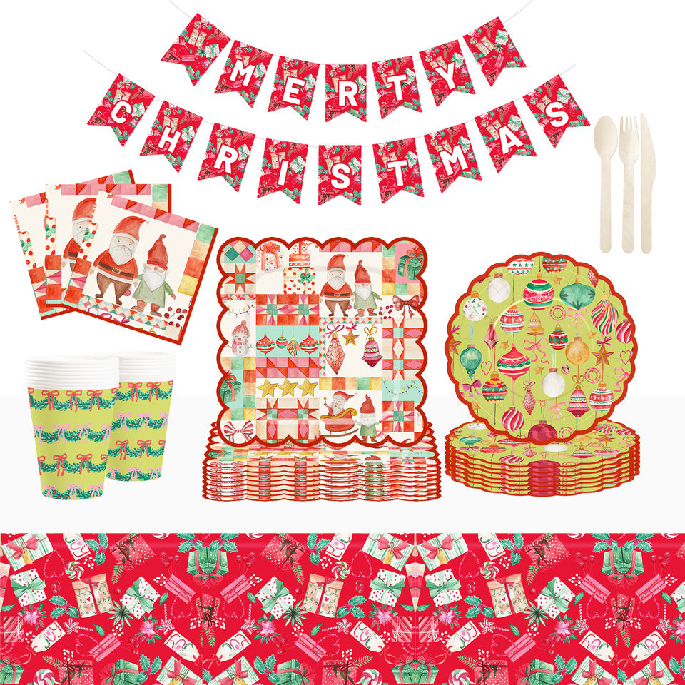 DAMAI Christmas Customized Party Tableware Set Disposable Christmas Santa Ring Bow Knot Star Gift Box Pattern Paper Plates