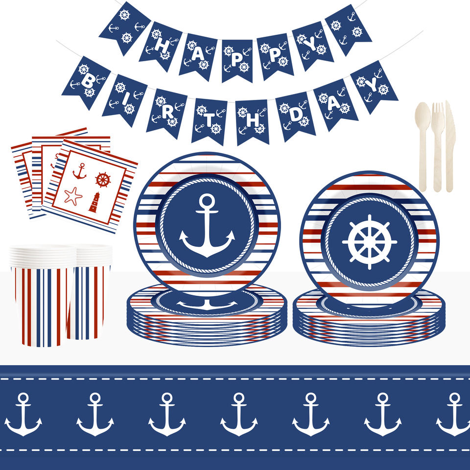 DAMAI Customized Dark Blue Navigation Happy Birthday Sailing Print Theme Paper Table Ware Set for Kid Boy Birthday Decorations