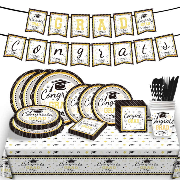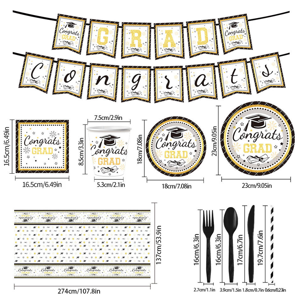 DAMAI Disposable Black Graduation Tableware Set Plates Napkins Cups Tablecloth Graduation Party Decor Kit for Grad Celebration