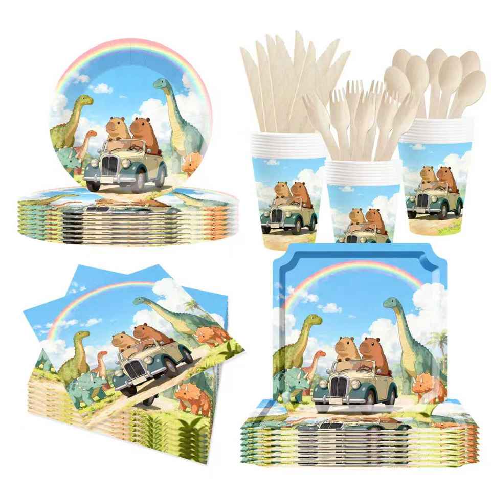 DAMAI Driver Kapibara Provided Disposable Paper Plates, Cups and Napkins for the Jurassic World Party at the Amusement Park