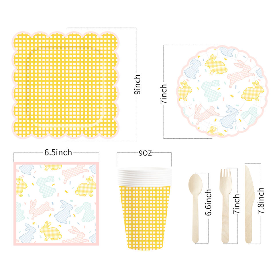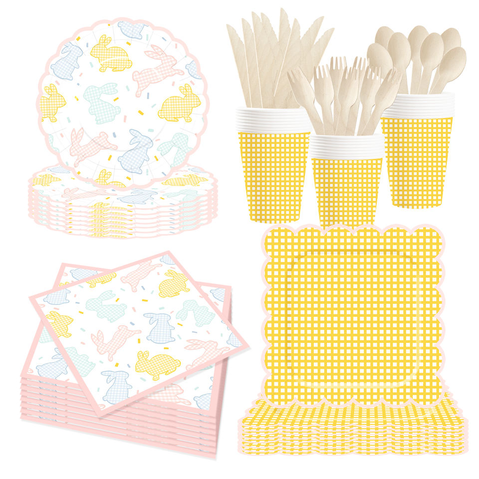 DAMAI Easter Party Theme Decor Bulk Wholesale Set Yellow Check Easter Rabbit Paper Plates Tablecloth Party Disposable Tableware