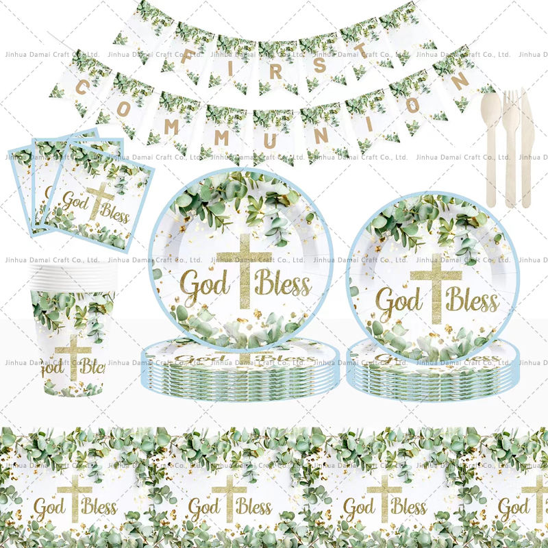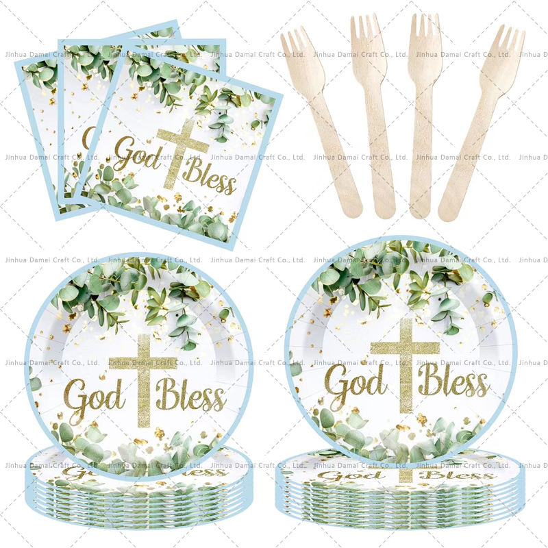 DAMAI God Bless Plates Baptism Tableware First Holy Communion Disposable Paper Dinnerware for Christening Baby Shower Supplies