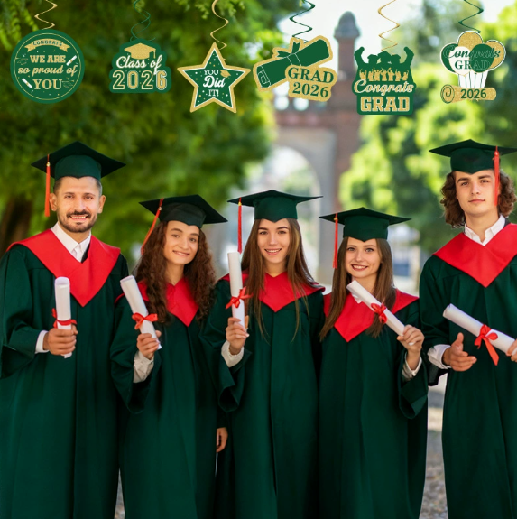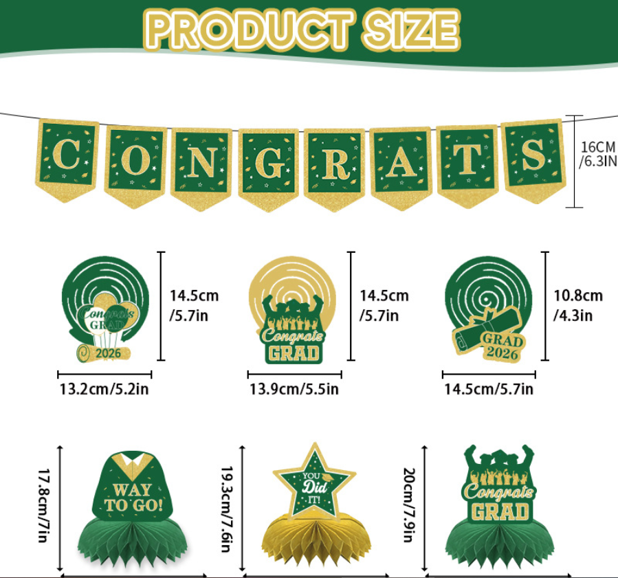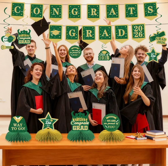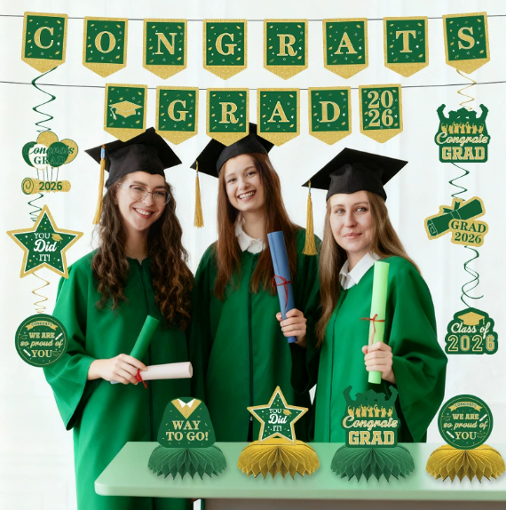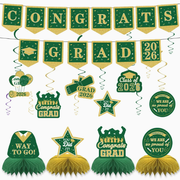 DAMAI Green Graduation Party Decoration Set Congrats Grad 2026 Party Supplies for Banner Hanging Swirls Honeycomb Centerpieces