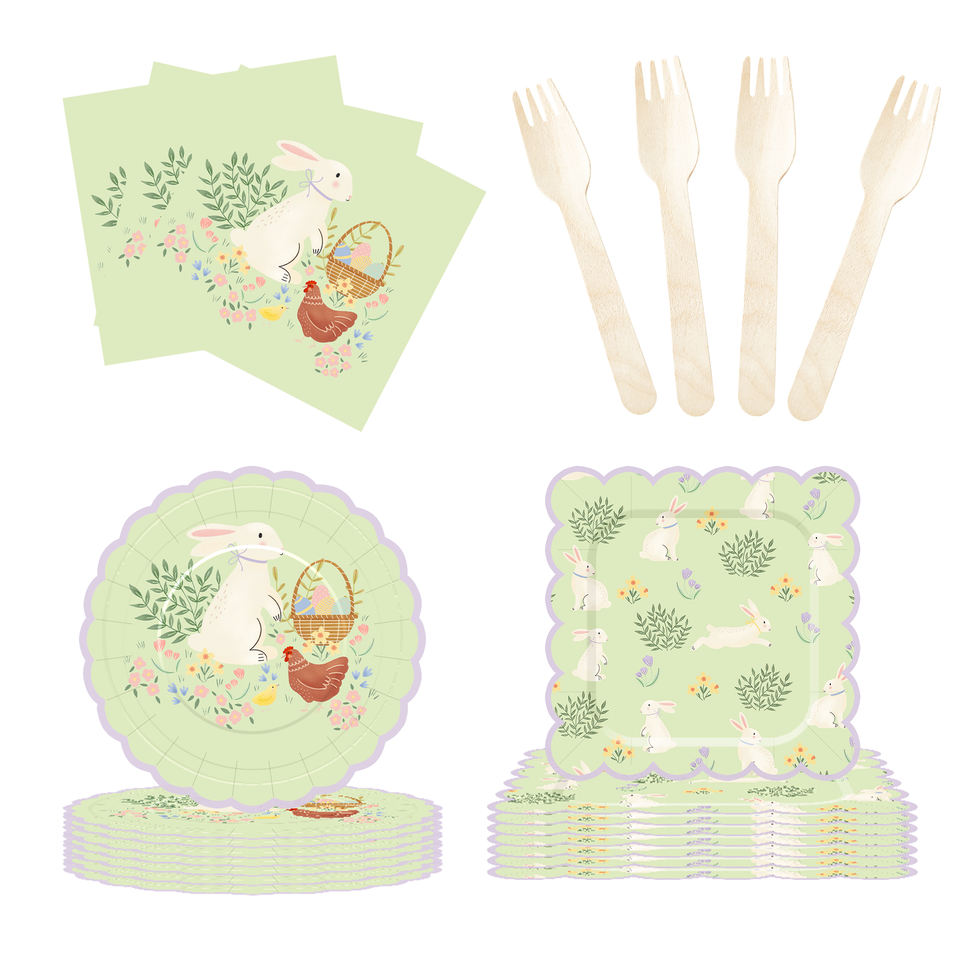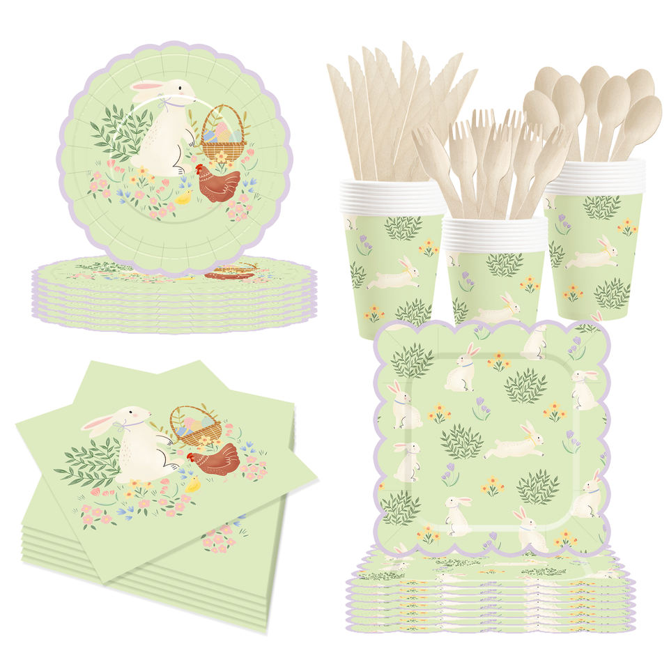DAMAI Happy Easter Theme Table Decorations Kit Light Green Disposable Paper Plates Banner Napkin Party Tableware Set