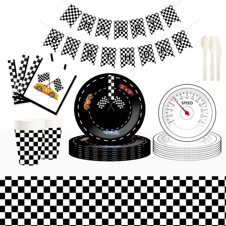 DAMAI Kid Theme Racing Car Black and White Disposable Dessert and Dinner Paper Plate Cup Party Tableware Set