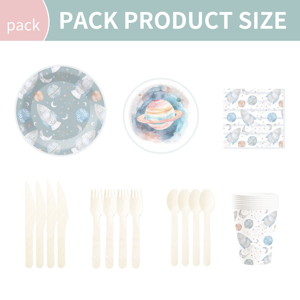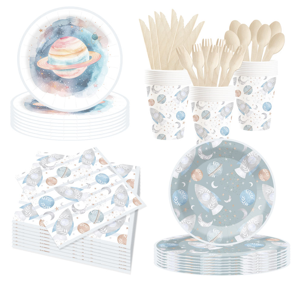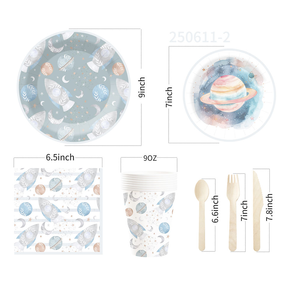 DAMAI New Customized Blue Space Theme Disposable Dessert Dinner Paper Plates Cups Napkin Tableware Set with Rocket
