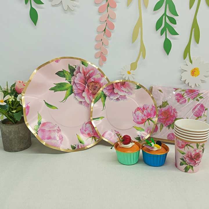 DAMAI Spring Tea Party Decor Supplies Flower Theme Party Pink Peony Wave Edge Paper Plates Disposable Set Cups Napkins Sets