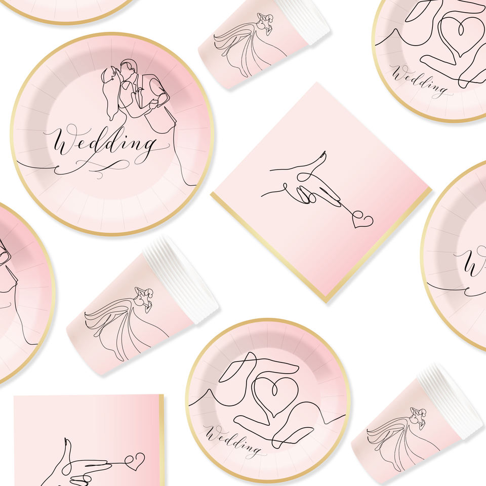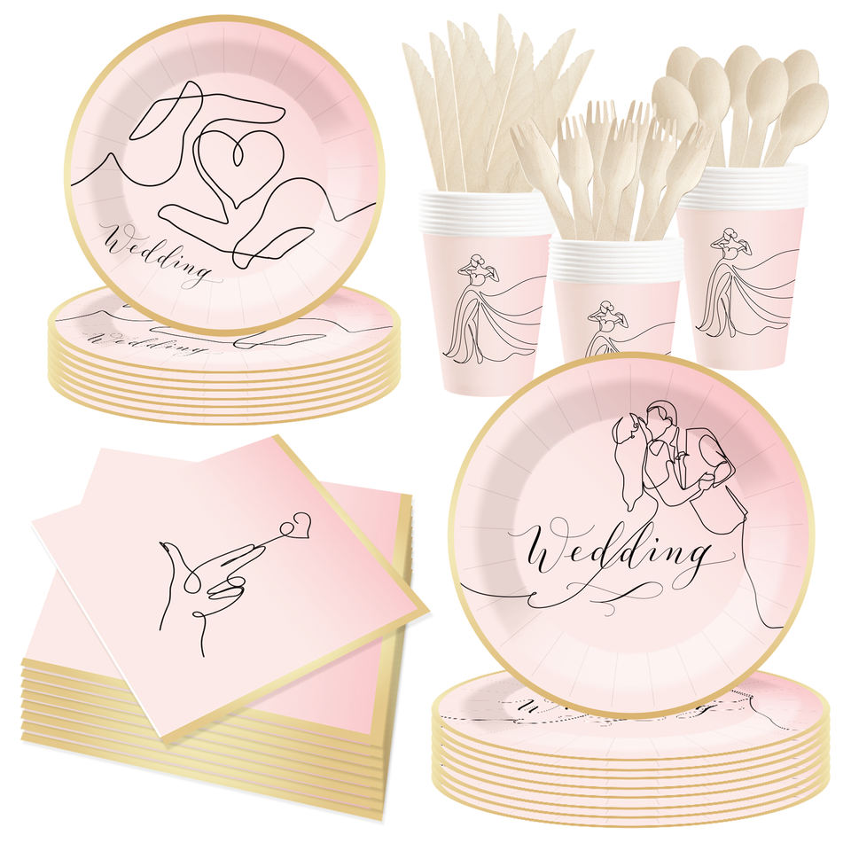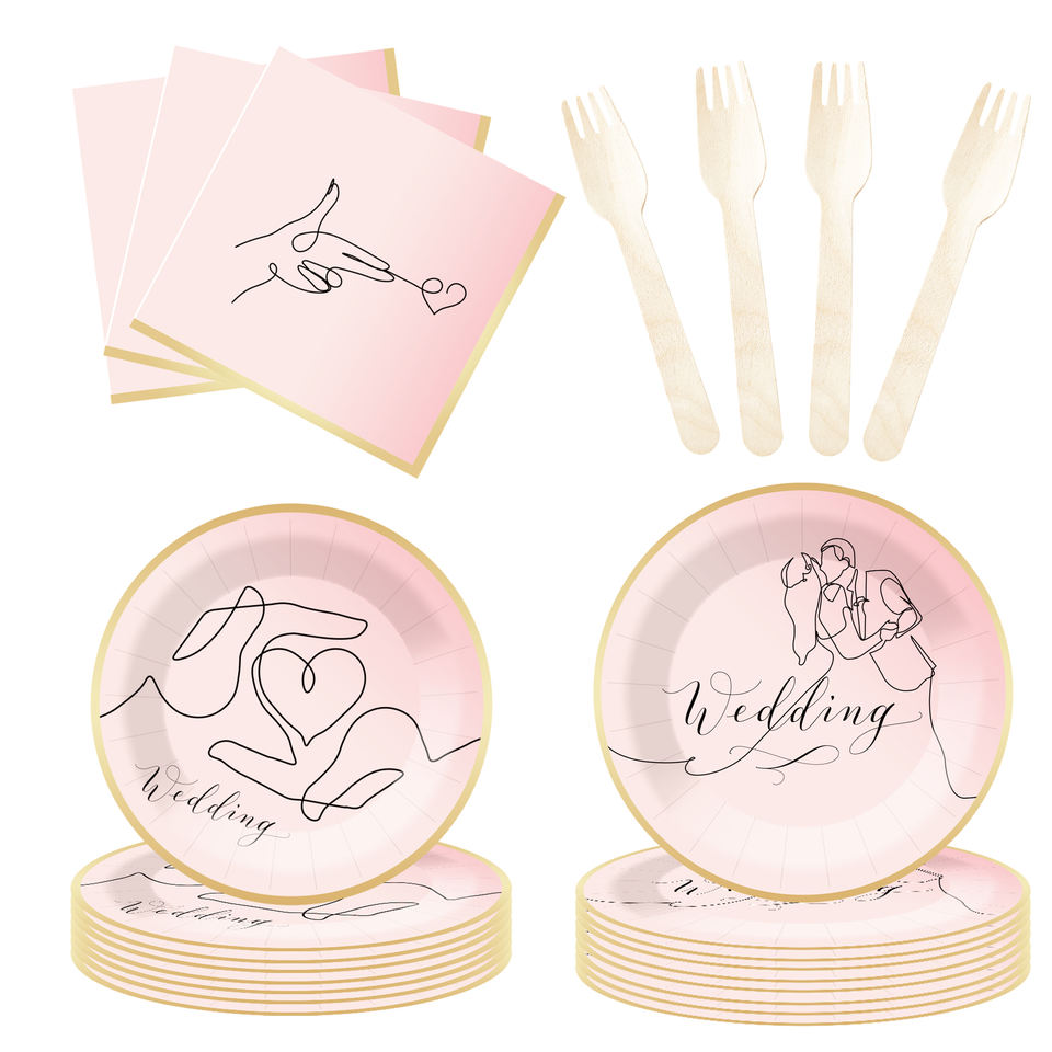 DAMAI Wedding Disposable Party Tableware Set Pink Paper Plates with Golden Design for Bridal Shower Supplies Serves 8 pcs