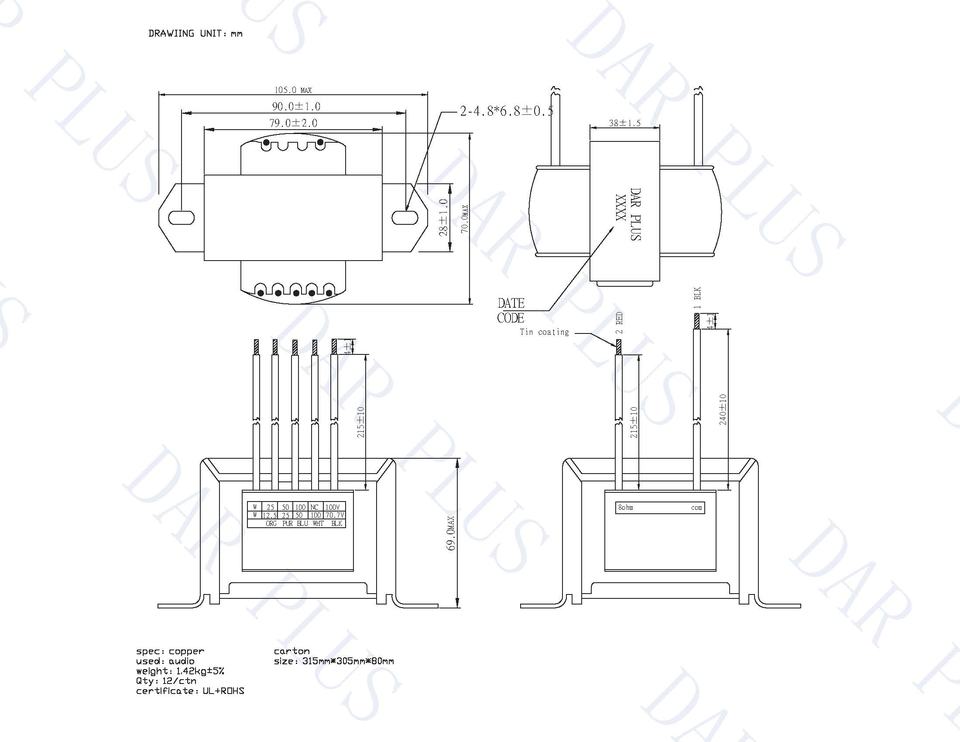 DAR PLUS Multi-Winding Coil Copper Winding Square Type Single Phase 50Hz Best EI76*35 Audio Transformer for ROHS for 70.7V