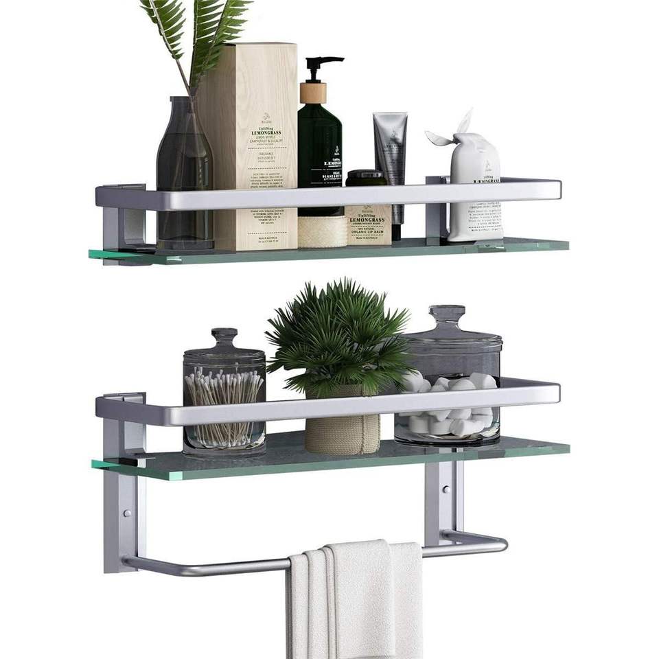 DB 15.7in Wall Mounted Bathroom Shelf with Floating Glass and Steel Towel Holder 2-Tier Glass Shower Shelf