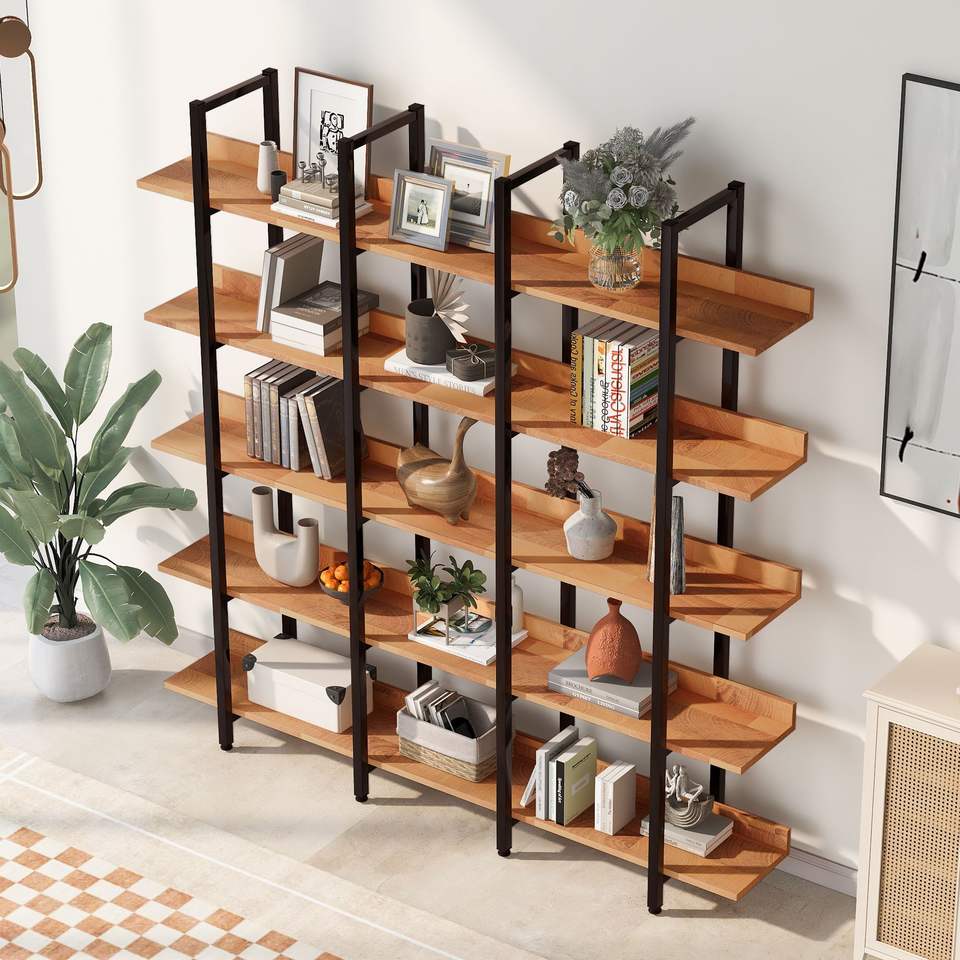 DB 5 Tier Bookcase with Vintage Industrial Style MDF Board Black Metal Frame Open Bookshelf for Home Office Workshop or Hotel