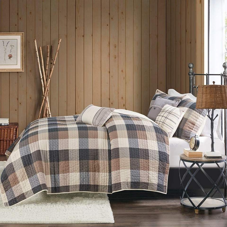 DB 6-Piece Printed Herringbone Quilt Set Throw Pillows Neutral Full/Queen 3D Patchwork Technics Cotton for Weddings Hotels