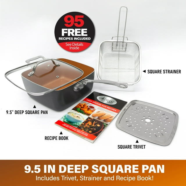 DB 6 Qt Casserole Set-4 Piece Nonstick Copper Deep Square Chef's Pan & Frying Basket XL Stock Pot & Colanders & Strainers