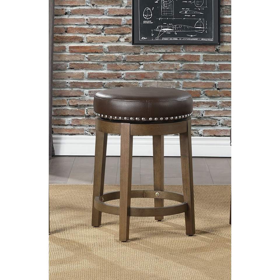 DB Brown Faux Leather Counter Height Stools Set 2 360-Degree Swivel Seat Nailhead Trim Solid Wood Frame Dining Room Furniture