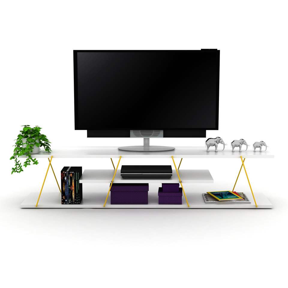 DB FurnisHome 56-Inch Low TV Stand with 4 Shelves Open Storage Mid Century Modern Metal Cords Entertainment Centre LED Feature