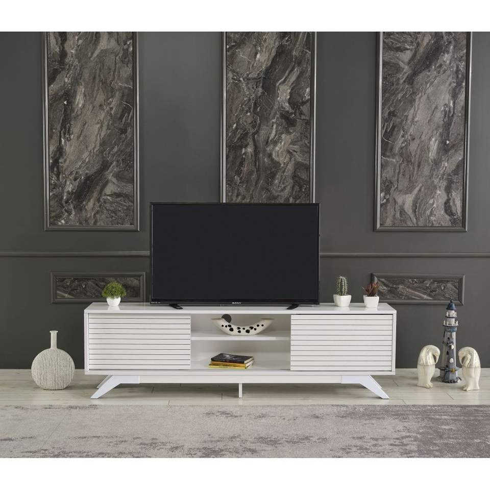 DB FurnisHome Luxia Mid Century Modern TV Stand 67-Inch TV Cabinet 2 Sliding Doors 2 Shelves Uni White Panel for Living Room