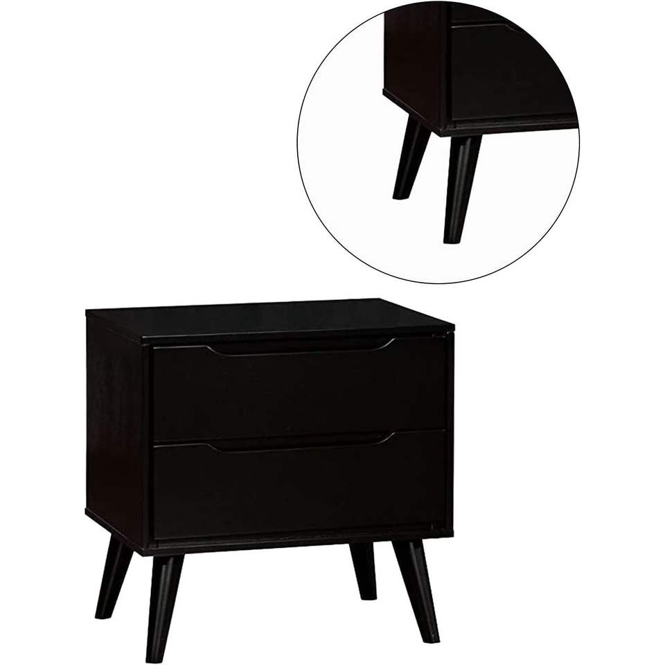 DB Mid-Century Modern Solid Oak Nightstand Black Color 1pc Bedroom Furniture Tapered Legs 2-Drawers Bedside Table for Apartment